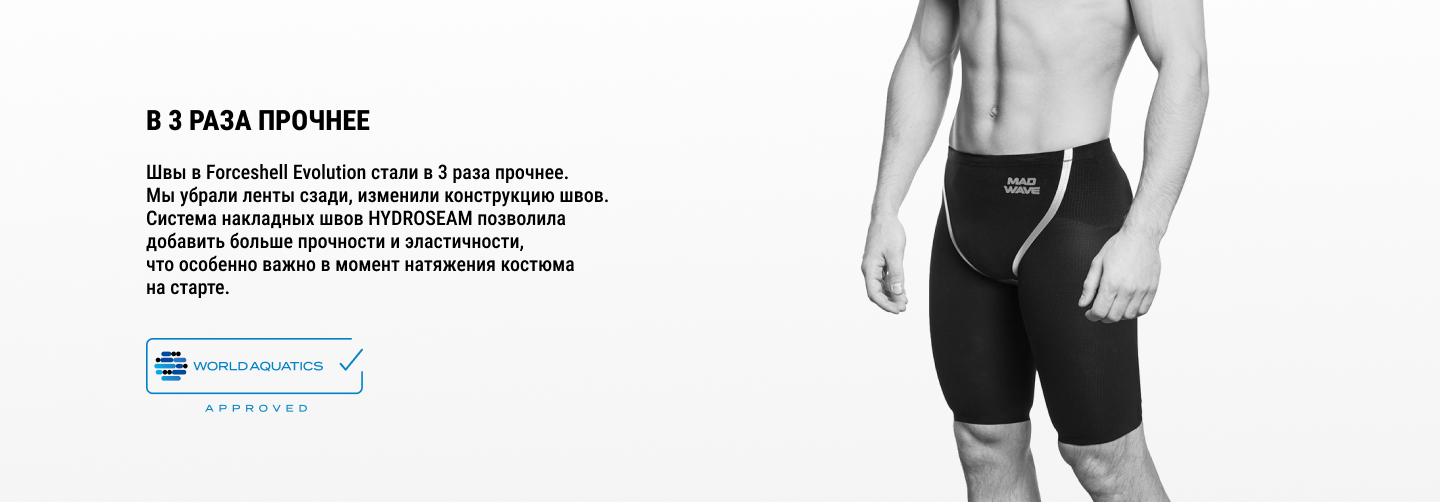 Теперь мужской стартовый гидрокостюм Forceshell доступен в новой улучшенной версии Forceshell Evolution. Мы убрали ленты сзади, изменили конструкцию швов, что сделало костюм прочнее, эластичнее и гидродинамичнее. Все, ради быстрых секунд.